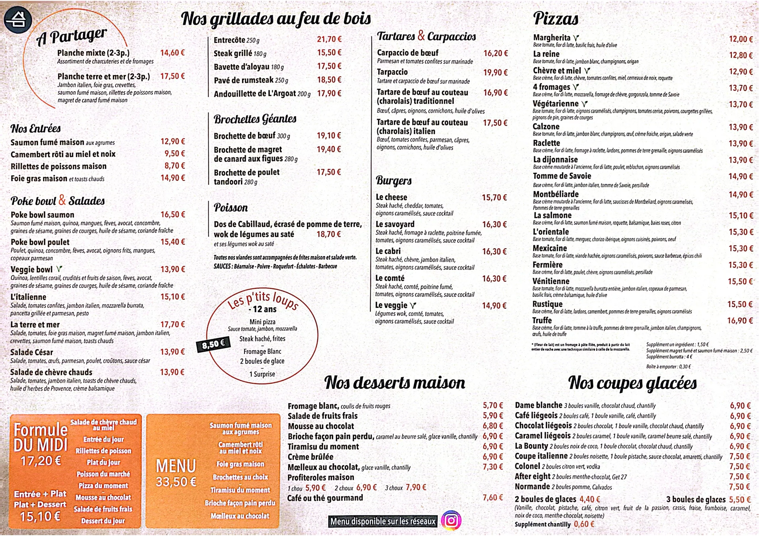 Notre restaurant a le plaisir de vous accueillir dans une ambiance conviviale et de vous proposer une carte très variée. Une véritable invitation à un voyage gustatif, à travers nos grillades au feu de bois, notre formule du midi et nos formules « entrée + plat ou plat + dessert ».
